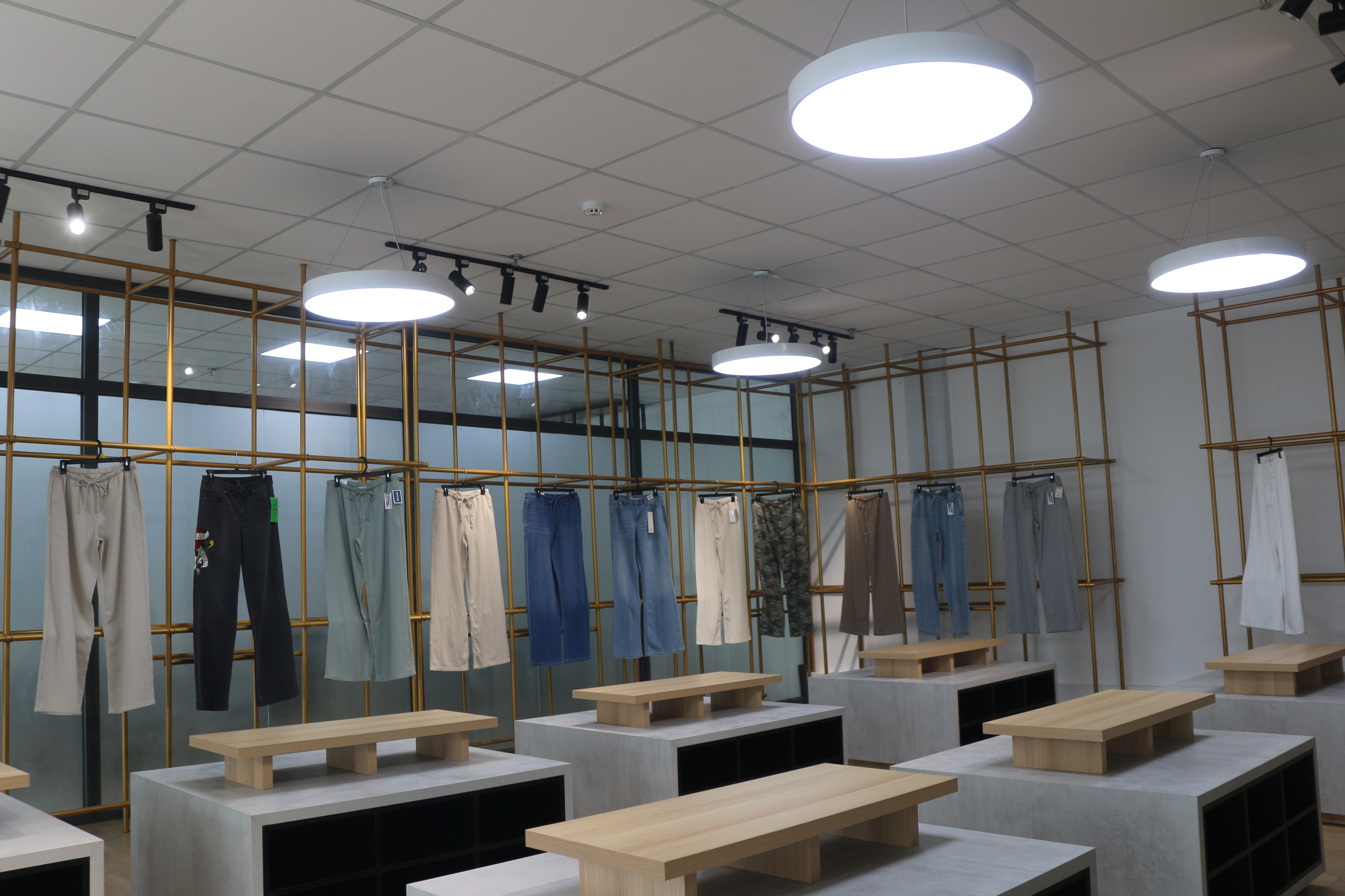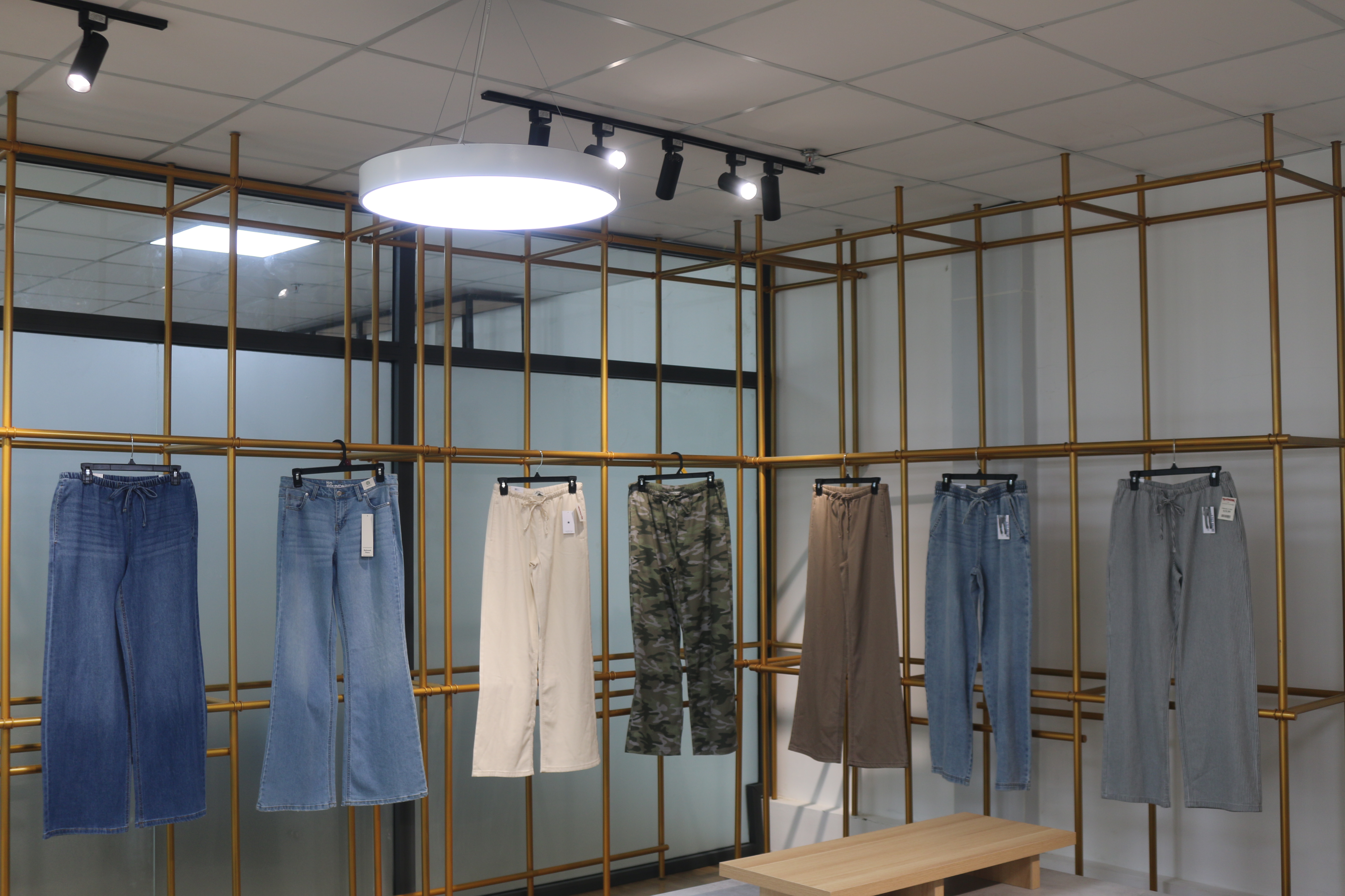 Mỗi chiếc quần được treo ngay ngắn, khoảng cách đều nhau, ánh sáng chiếu trực tiếp giúp làm nổi bật chất liệu, màu sắc và đường may. Việc sử dụng móc treo đồng bộ và khung kim loại không chỉ tạo sự sang trọng mà còn giúp khách hàng dễ dàng so sánh kiểu dáng. Đây là xu hướng “tối giản hóa” trong thiết kế cửa hàng – nơi sản phẩm là trung tâm và không gian xung quanh đóng vai trò hỗ trợ.