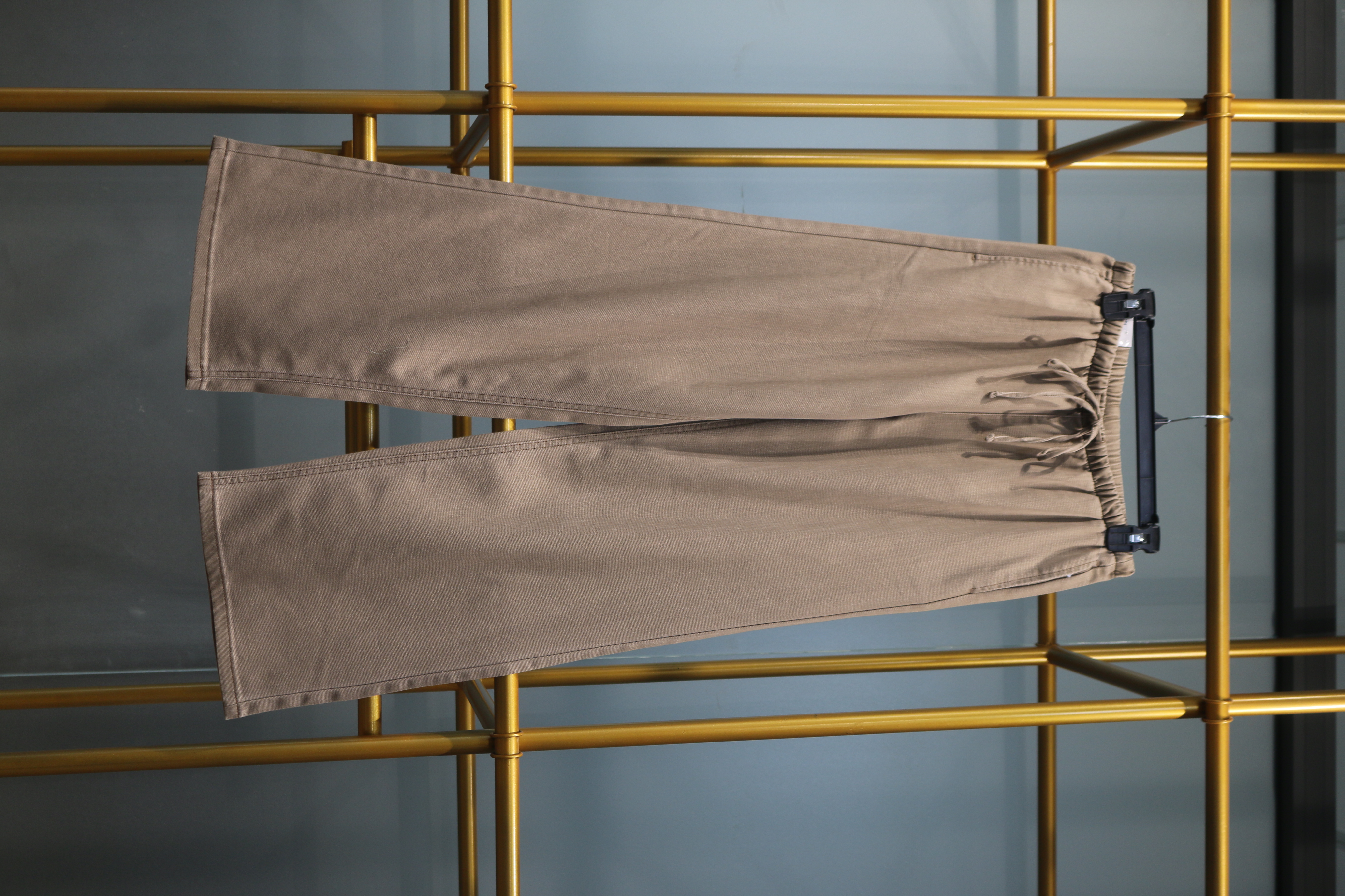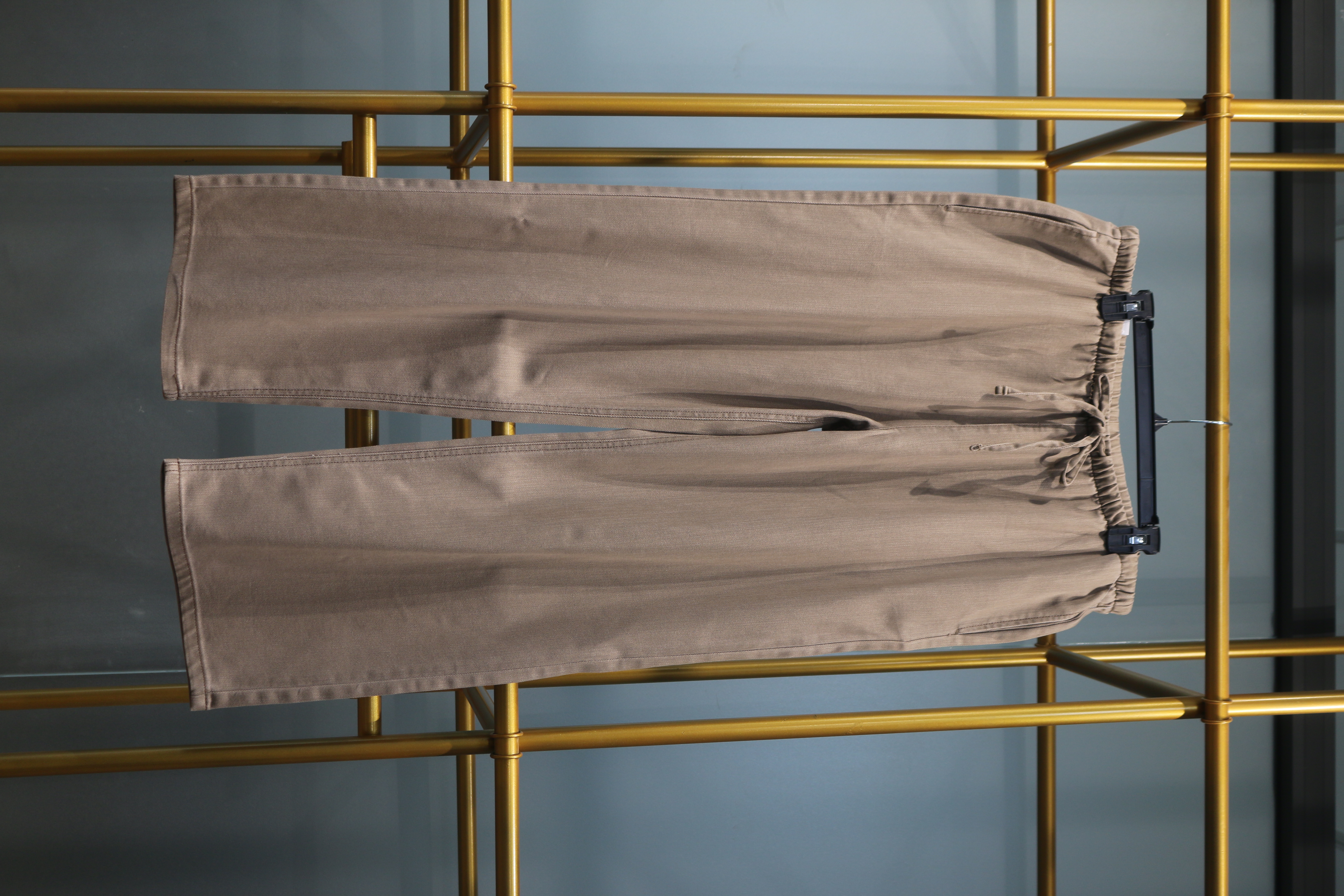 Bộ đôi quần dài màu be này là lựa chọn lý tưởng cho những ai yêu thích sự thoải mái và thanh lịch trong trang phục hàng ngày. Cả hai mẫu đều được treo trên móc đen, nổi bật giữa khung kim loại màu vàng sang trọng, tạo nên một không gian trưng bày thời trang đầy tinh tế.